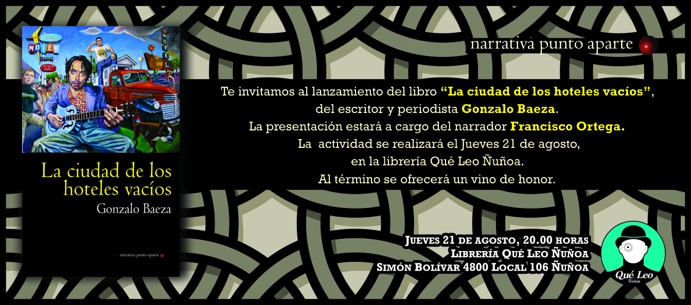 La ciudad de los hoteles vacíos, primer libro de Gonzalo Baeza, es un conjunto de catorce relatos cuyos personajes transitan por ciudades y poblados del Medio Oeste estadounidense buscando trabajo y recalando en hoteles y bares de mala muerte, cines porno, comederos baratos, granjas en decadencia, periódicos amarillistas. Mediante una prosa áspera, nudosa y compacta, surge un mismo protagonista, un tipo sin lugar, arisco, ensimismado, en permanente deriva por un territorio representado como un corredor o laberinto sin salida, donde solo le queda concentrarse en pasar el día.
